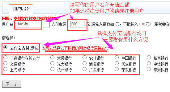 在线自助购买任何产品或注册域名都需要先注册用户,并对用户充值才能在线直接购买